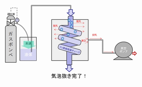 それを気密性高い真空チャンバーに入れ、中をポンプで真空引きする。そうすることでフッ素樹脂配管の内外で圧力勾配を生じさせ、液体に溶け込んだ気泡を引き抜くシステムです。